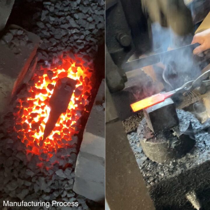 Using the same process as that used in sword smithing, the metal is heated to bright red and beaten to create a blade that combines two types of steel (Yasugi speciality steel + soft steel), while at the same time increasing the metal density (hardness).