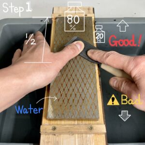 +【デラックス砥石#1000・嵐山仕上砥石#6000】を使用している時に出る【研ぎ汁】は洗い流さず砥石が乾かない様、少量の水をかけながら研いで下さい。研ぎ汁は刃研ぎ潤滑剤です。